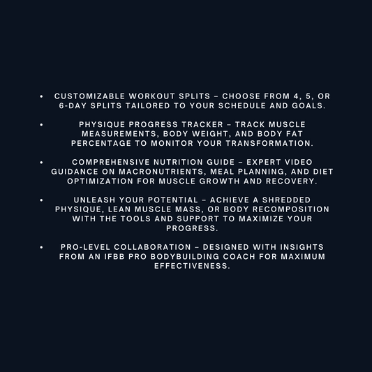 Our one-time, fully customized diet and training program is perfect for anyone serious about hitting their goals without ongoing coaching. We tailor everything to fit your fitness level, lifestyle, and objectives—whether it's building muscle, losing fat, or gaining strength. It's like having expert guidance without the commitment.
